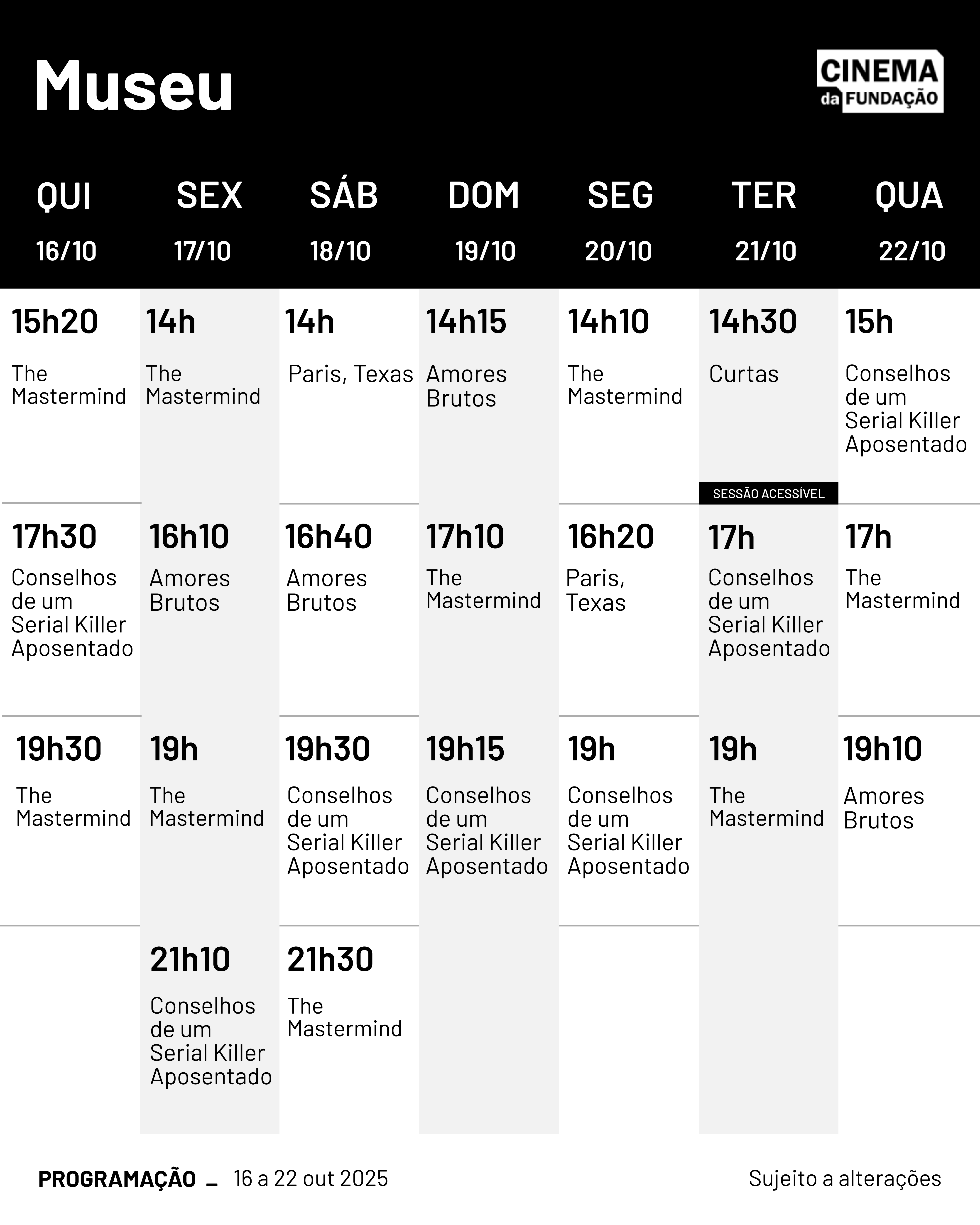 CLOSE-UP | O Cinema da Fundação, nas salas Derby e Porto, dá início ao Festival Close-UP: Cidade, Arquitetura e Paisagismo a partir desta quarta-feira (15). Na programação gratuita, entre 15 e 19 de outubro, oferecemos 13 filmes, 2 cine-concertos com o DJ Jean-Yves Leloup e 2 debates distribuídos em 18 sessões destinadas a todos os público. Saiba mais.