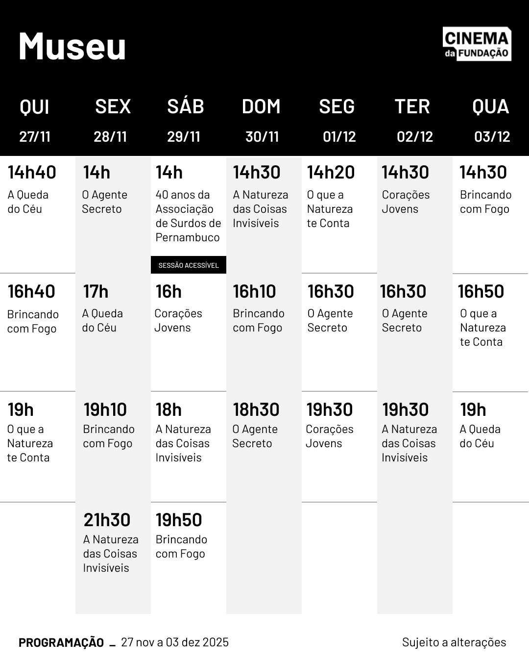 INGRESSOS | Está no ar a nova plataforma de venda de ingressos do Cinema da Fundação! Agora, os ingressos para as salas Derby, Museu e Porto podem ser adquiridos pela plataforma online Velox Tickets. A venda online é realizada com 100% da capacidade da sala. Já a bilheteria presencial segue funcionando (com pagamento em dinheiro, cartão de crédito, débito e Pix), mas está sujeita à disponibilidade de lugares após as compras feitas pela internet.