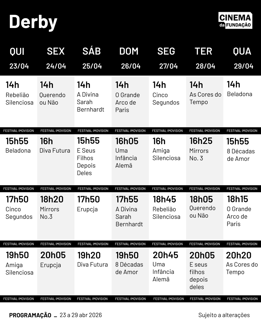 Programação | 23 a 29 de abril de 2026 18 de maio de 2022 Ingressos para a sala Derby disponíveis online no Velox Tickets Ingressos para a sala Museu disponíveis online no Velox Tickets Programação | 23 a 29 de abril de 2026